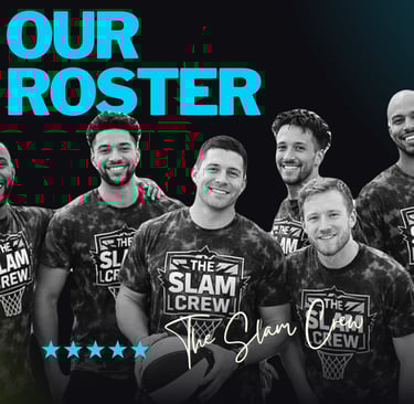 The Slam Crew roster is built for excitement, skill, and show-stopping entertainment. Led by DJ D Mac from San Antonio, our lineup features elite talent across every position—from Derrick “Handles” Jones at point guard to Jeremy “Jerm” Thompson dominating the paint at 7’1”. With high-flying dunkers, master ball handlers, and skilled shooters, our team brings energy, creativity, and unforgettable performances to every court we step onto.